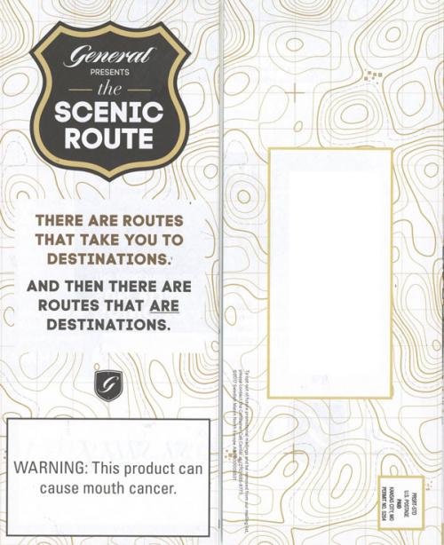 Direct mail from General Snus received in July 2017 that describes The Scenic Route, a travel feature on interesting roads throughout America. The piece arrived in a clear envelope and folds out like a map to show descriptions of the various roads. Includes an offer for free issues of Elevated magazine, available through the brand website, and nearby retail locations. Also includes coupons.