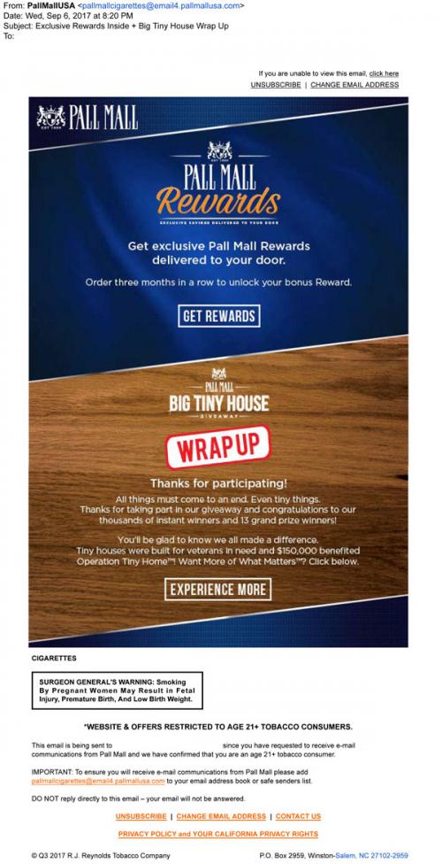 Pall Mall email from September 2017 with a Big Tiny House giveaway "wrap up", thanking the recipient for participating and announcing how much money was raised for veterans in need. Also includes a reminder to claim rewards coupons and a promise for a bonus reward when coupons are claimed 3 months in a row.