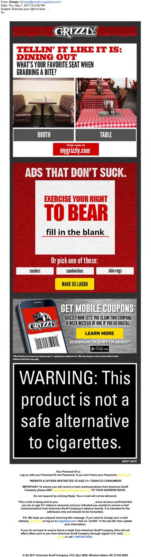 Grizzly email from September 2017 inviting the recipient to interact on the brand website, with a new "Tellin' it like it is" topic and prompt for "Ads that don't suck." Also supplies a link to claim mobile coupons through the site or download the app through the app store.