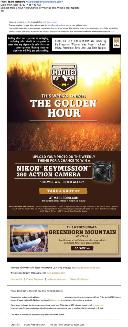 Marlboro email from September 2017 promoting the next week's theme for the Undivided photo contest. Links to the brand website to enter, and also links to an update about local trail work in Montana.