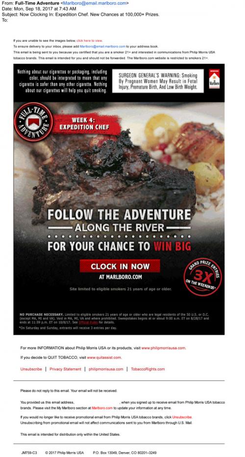 Email from Marlboro in September 2017 promoting a new week of the Full Time Adventure sweepstakes. Links to the brand website to enter.