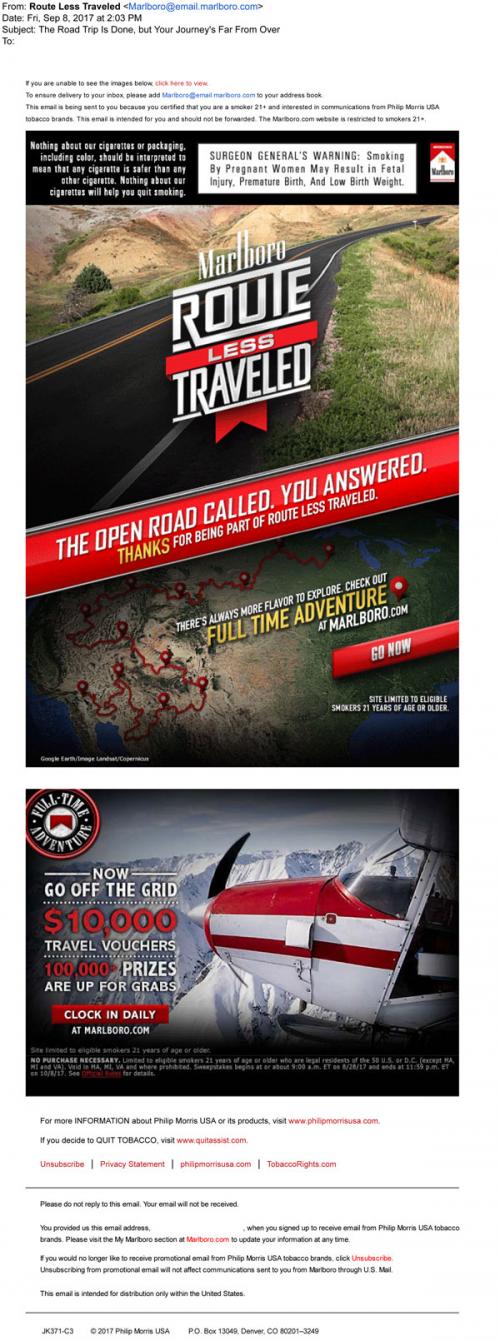 Email from Marlboro in September 2017 thanking the recipient for participating in the Route Less Traveled sweepstakes and promoting the next giveaway, Full Time Adventure, with a link to the brand website to enter.