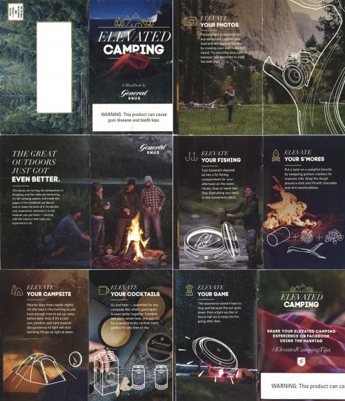 Direct mail received in September 2017 from General Snus consisted of a tiny booklet titled Elevated Camping. Includes tips to improve your camping experience, from food to handy uses for snus lids. Has an invitation to share your own tips on Facebook using the specialized hashtag, #ElevatedCampingTips. Also includes coupons and some nearby retail locations to "stock up before your next trip."
