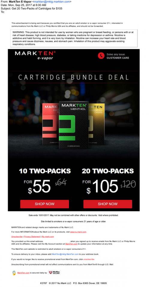 Email from MarkTen in September 2017 promoting a cartridge bundle deal on the brand website, with menthol and new limited flavors as the centerpiece. Links to the online store to buy.