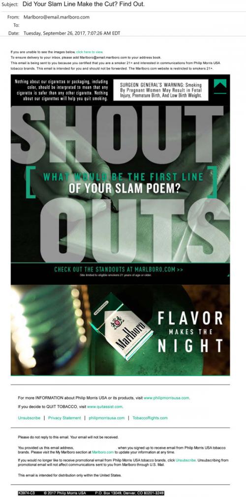 Email from Marlboro Menthol in September 2017 inviting the recipient to interact on the brand website in a section called Shout Outs, with the topic being "What would be the first line of your slam poem?" Links to the site to read the best entries.