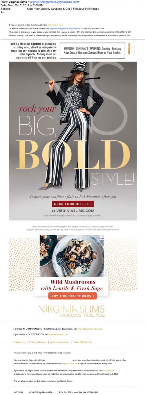 Email from Virginia Slims in October 2017 linking to the brand website to claim monthly coupons and get a new recipe.