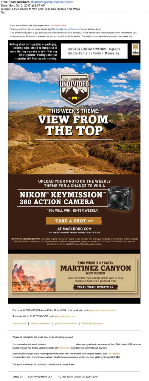Team Marlboro email from October 2017 promoting the weekly theme from the Undivided trail photo contest; the recipient can follow a link to enter for a chance to win a Nikon camera and to read about a local trail project.