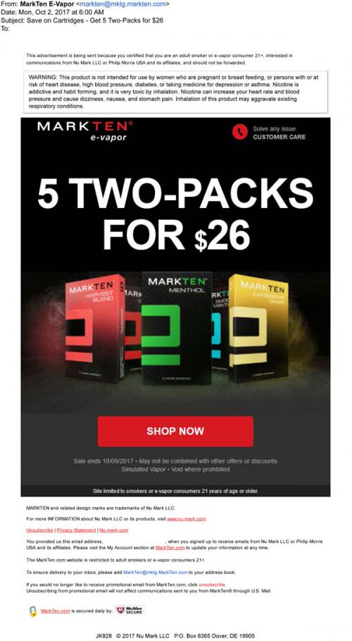 MarkTen email promotion in October 2017 about a cartridge sale taking place through their online store. The imagery has the new flavors and menthol products as the focus. Links to the brand website to shop.