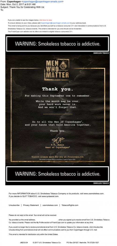 Copenhagen email from October 2017 closing out the September "Men Who Matter" campaign with a thanks to the recipient for participating, and a thanks to "all the men of Copenhagen, and your hands that hold America together."