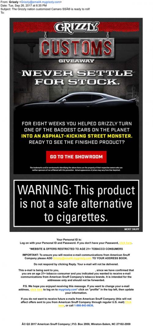 Email from Grizzly in September 2017 inviting the recipient to take a look at the results from the Customs Giveaway; links to the brand website to see the customized car in its final form.