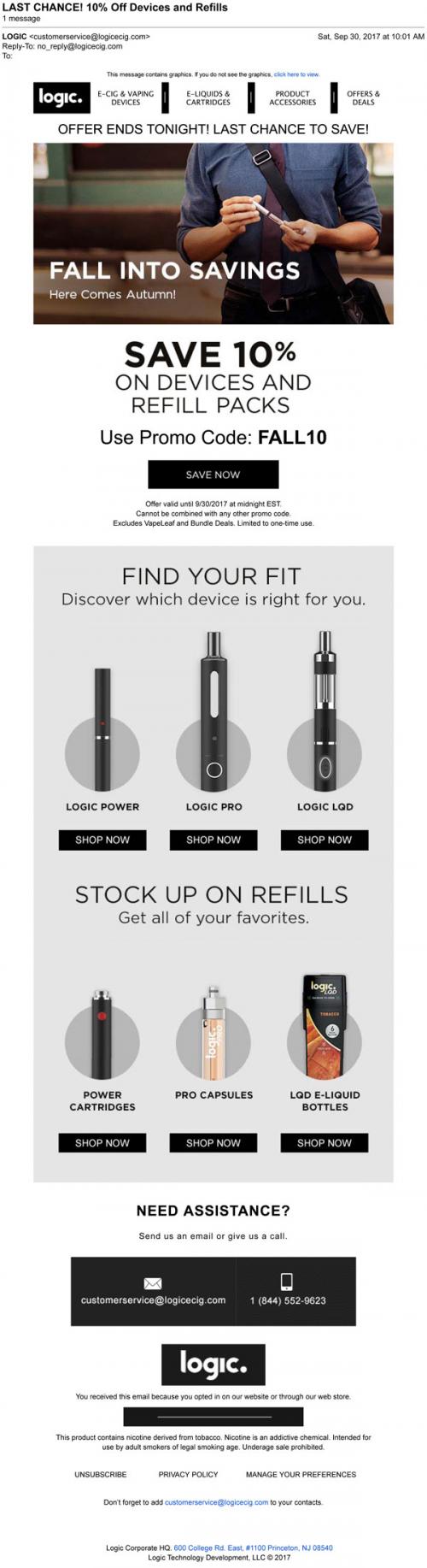 Logic email from September 2017 promoting the final day of their fall sale, showing various products for purchase and providing a discount code for use through the online store.