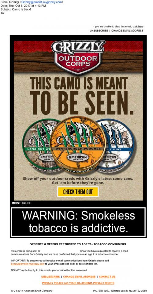 Grizzly email from October 2017 promoting the new camo cans, now available in stores. Provides a link to the brand website to see them.
