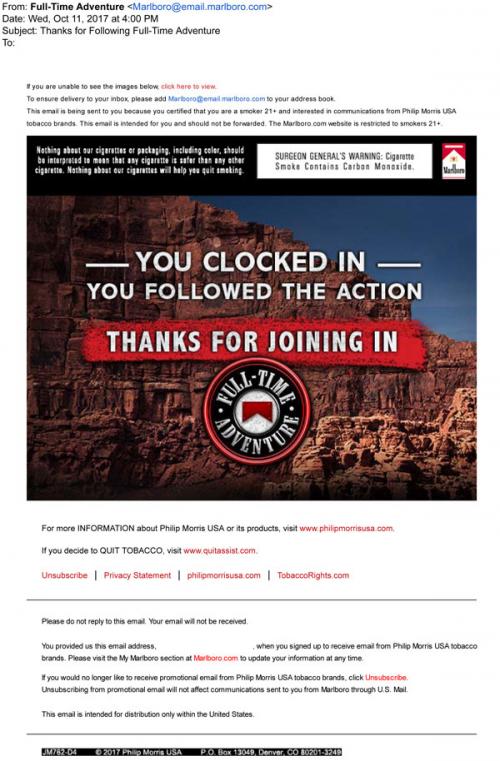 Email from Marlboro in October 2017 thanking the recipient for participating in the Full Time Adventure sweepstakes.