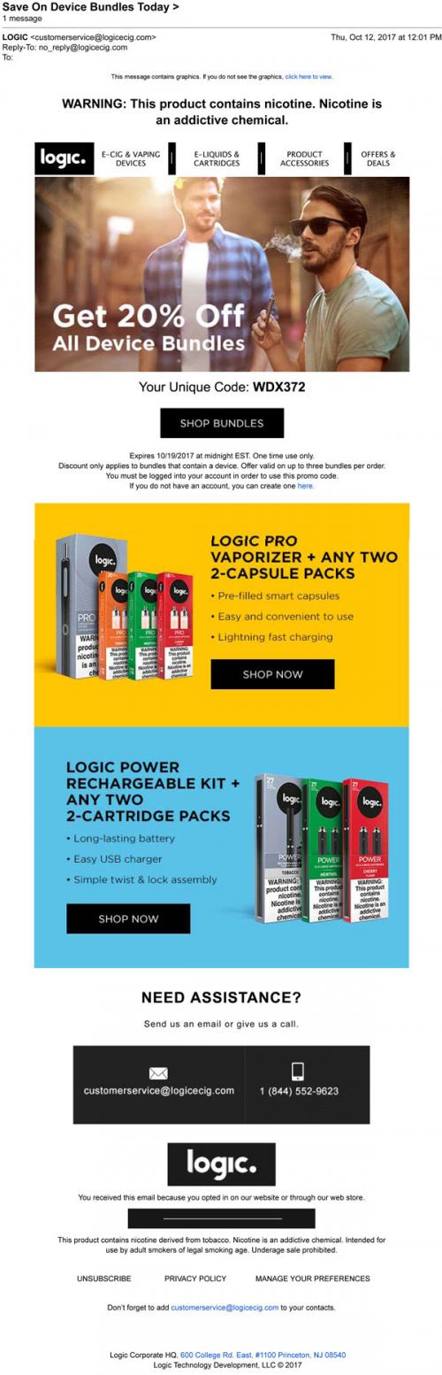 Email from Logic in October 2017 promoting a sale on device bundles through the brand website; links to the online store to purchase and learn more about the Pro and Power product styles.