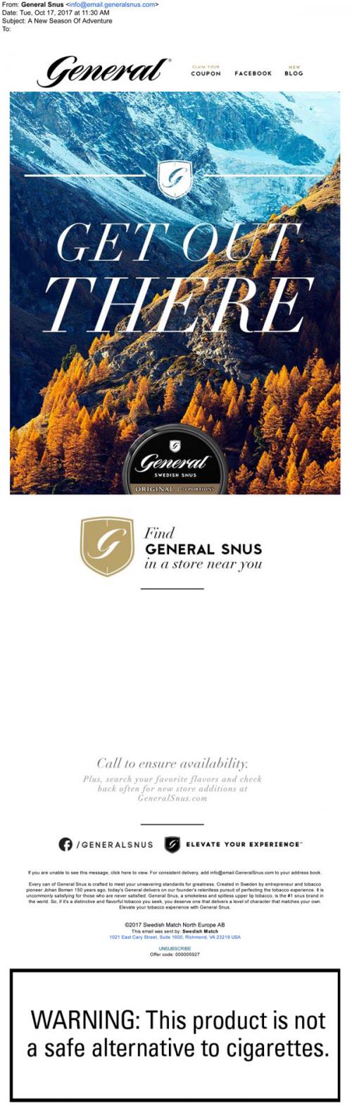 General Snus email from October 2017 instructing the recipient to "Get Out There" and welcome "a new season of adventure" with a picture of a scenic mountain range. Includes some nearby retail locations to buy their products at and a link to claim coupons on the brand website or check out their social media and blog.