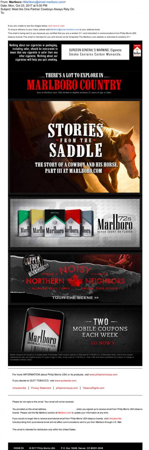 Email from Marlboro in October 2017 linking to the brand website to check out