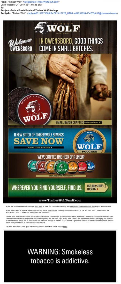 Timber Wolf email from October 2017 linking to the brand website to claim a coupon, see the product lineup, and use a store locator. Promotes the brand's small batch, local craftsmanship.