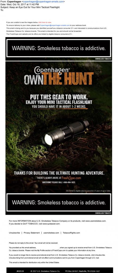 Email from Copenhagen in October 2017 letting the recipient know that a free gift of a mini tactical flashlight to promote the Own the Hunt sweepstakes will be arriving in the mail soon. Thanks the recipient for participating and links to the brand website to experience more.