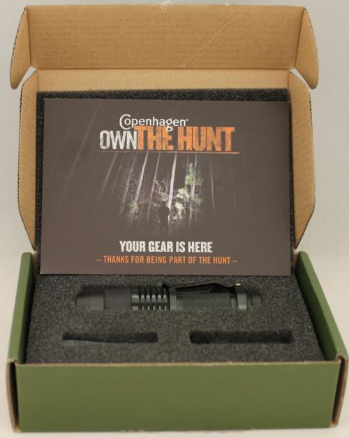 A tactical flashlight arrived in October 2017 via direct mail in an olive green box as promotion for the Own the Hunt sweepstakes. The card included in the box thanks the recipient for "being part of the hunt" and further promotes the brand website .