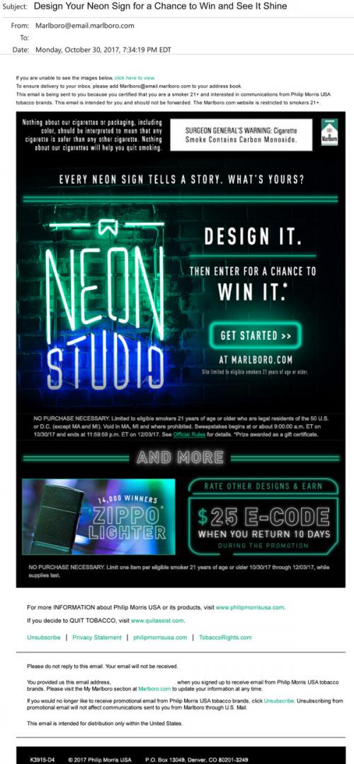 Marlboro Menthol email from October 2017 promoting the Neon Studio contest on the brand website, where you can design a neon sign. Participating in the event and voting on other's designs can win you a Zippo lighter or a 25$ e-code, getting people to return to the site multiple times during a promotion.