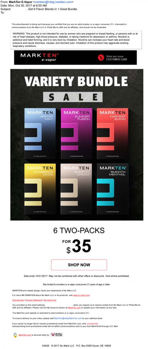 MarkTen email from October 2017 offering a discount on a bundle of various flavored cartridges, including their limited edition Harvest Blend. Links to the brand website to purchase.