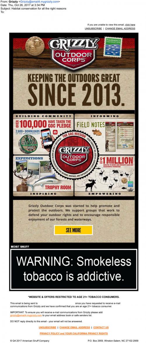 Grizzly email from October 2017 promoting the Grizzly Outdoor Corps and conservation efforts made by the brand. Mentions the TrophyShots app, Field Notes, and links to the brand website to learn more about the various facets of this project.
