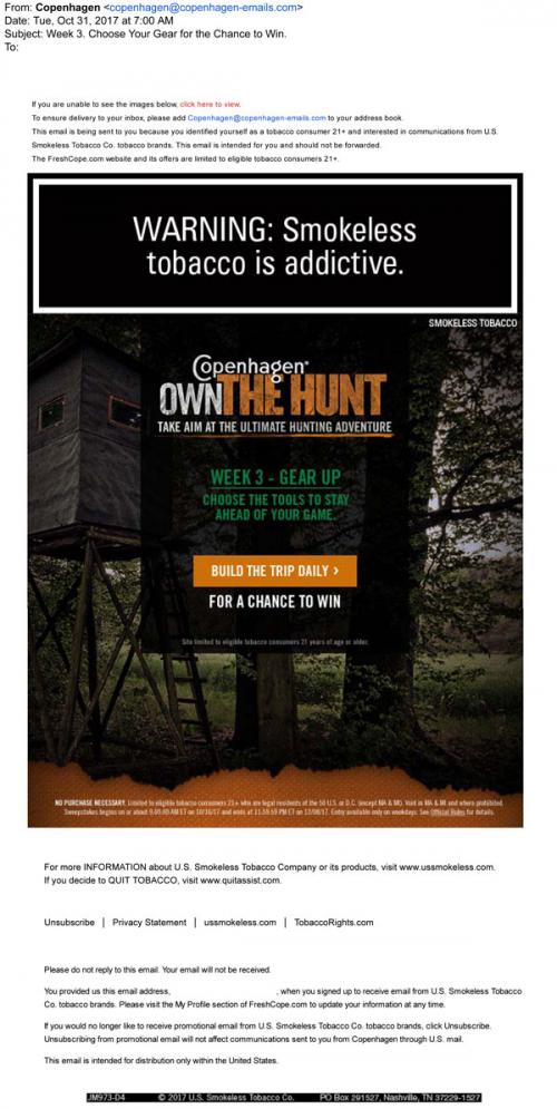 Email from Copenhagen in October 2017 promoting the Own the Hunt sweepstakes. Links to the brand website to enter for a chance to win.