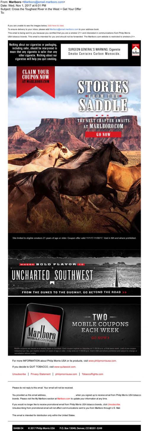 Email from Marlboro in November 2017 reminding the recipient to claim new monthly coupons, as well as extra weekly mobile coupons. Also promotes featured stories on the brand website, like Stories from the Saddle or Uncharted Southwest.