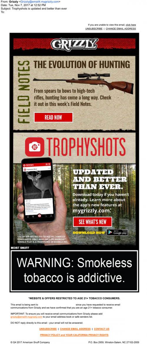 Email from Grizzly in November 2017 promoting the most recent Field Notes article that can be read on the brand website, as well as the updated TrophyShots app available to download.