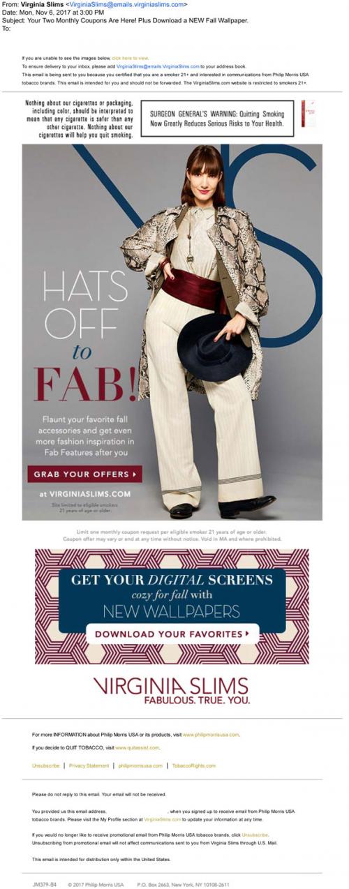 Virginia Slims email from November 2017 linking to claim monthly coupons and check out fashion inspiration on the brand website. Also includes a link to download new seasonal digital wallpapers.