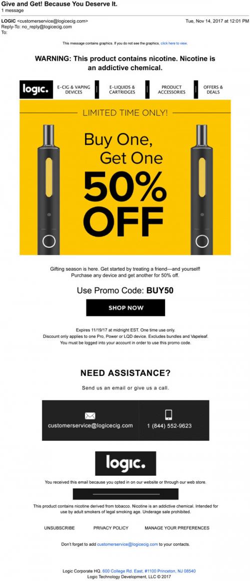 Logic email from November 2017 with a sale on devices through the brand website; links to the online store and provides a promo code to use.