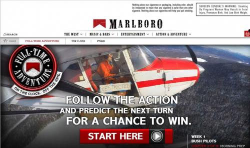 Screen captures of Marlboro's brand website taken in August 2017 detailing the Full Time Adventure sweepstakes. Visitors were invited to make a prediction to enter the contest, sign up for the mailing list with an email, and watch a related video.