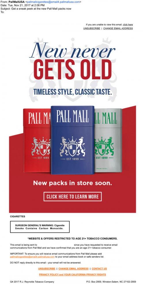Email from Pall Mall in November 2017 announcing the arrival of new packaging designs in stores soon. Shows the various styles they offer in the new packs with a link to the brand website to learn more.