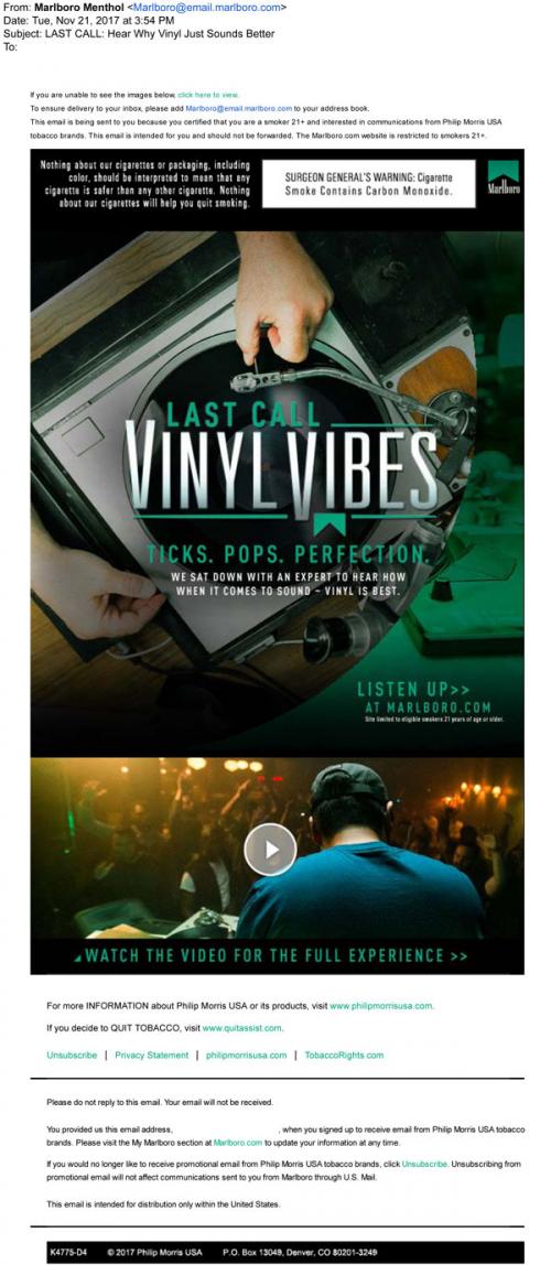 Email from Marlboro Menthol in November 2017 as a "last call" reminder to check out their Vinyl Vibes feature. Links to the brand website to hear about the vinyl music scene and watch a video.
