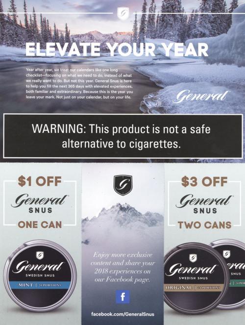 Direct mail received from General Snus in December 2017 containing an "exclusive gift" with a nod to the "elevated year ahead." Invites the recipient to "leave no day unexplored" in 2018 with a small desk calendar that has various holidays and spectacular events on the back. Contains coupons and encourages participation on their brand Facebook page in the coming year.