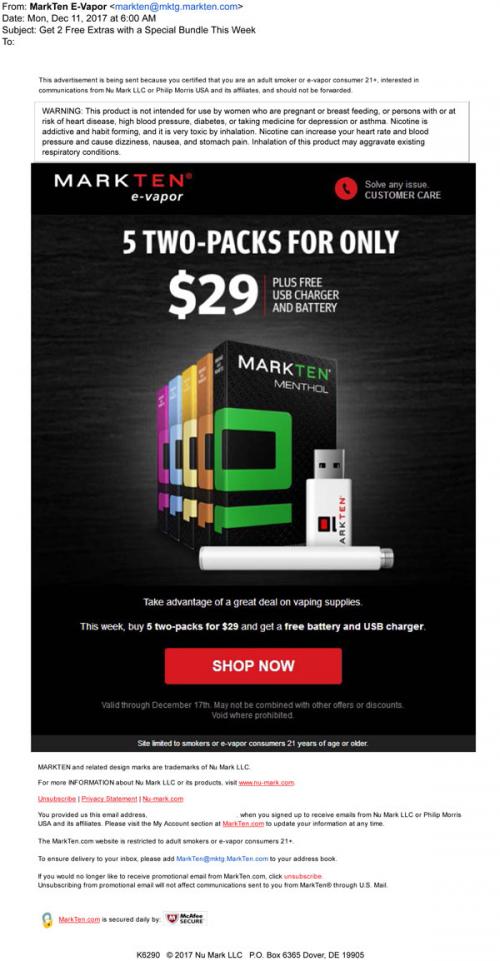 Email from MarkTen in December 2017 promoting a sale on cartridge packs through the brand website, including a free USB charger and battery with purchase. Links to the online store to shop.