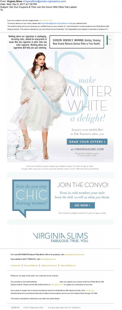 Email from Virginia Slims in December 2017 linking to claim monthly coupon offers on the brand website. Also encourages participation in a discussion about staying chic during winter despite the chill.