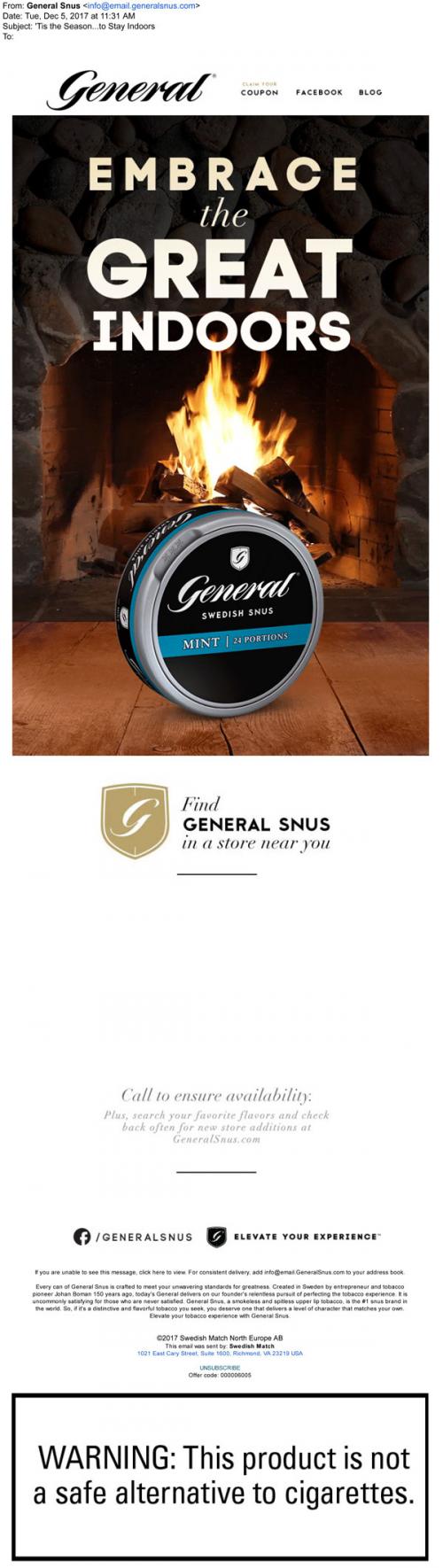 General Snus email from December 2017 with the copy, "Embrace the great indoors" that shows a can of product in front of a cozy fireplace. Links to the brand website to claim coupons or to use their store locator feature, with some convenient nearby locations listed in the email itself.