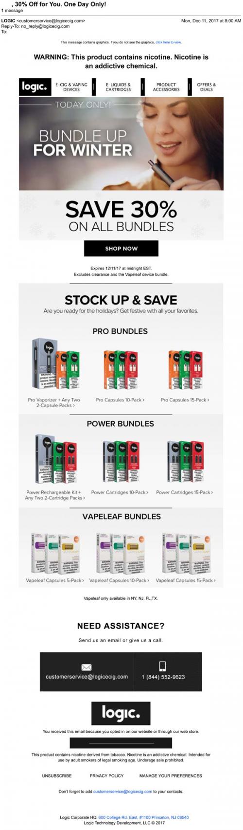 Email from Logic in December 2017 with the invitation to "bundle up" for winter with some seasonal savings on product bundles through the brand website. Links to the online store to take advantage of the limited time offer.