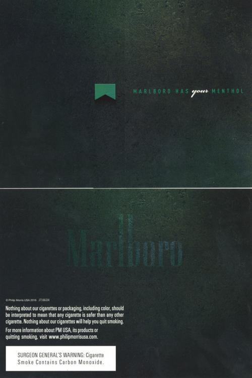 Direct mail from Marlboro received in December 2017 promoting their menthol products, saying, "Marlboro has your menthol." Includes images of the different packs and coupons to help the customer "find your flavor."
