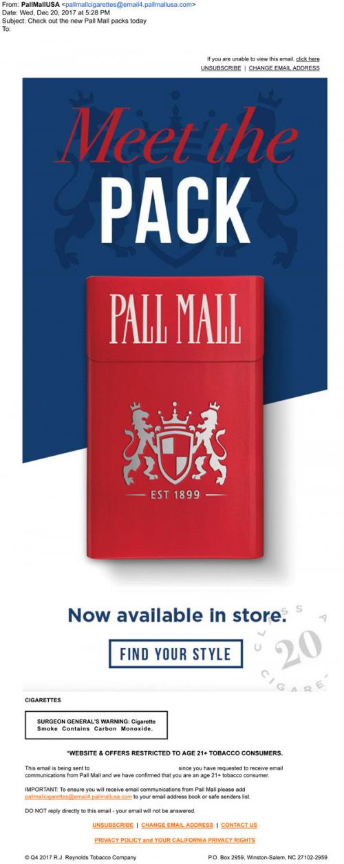 Pall Mall email from December 2017 promoting the new pack designs for their products, now available in stores. Links to the brand website to learn more.