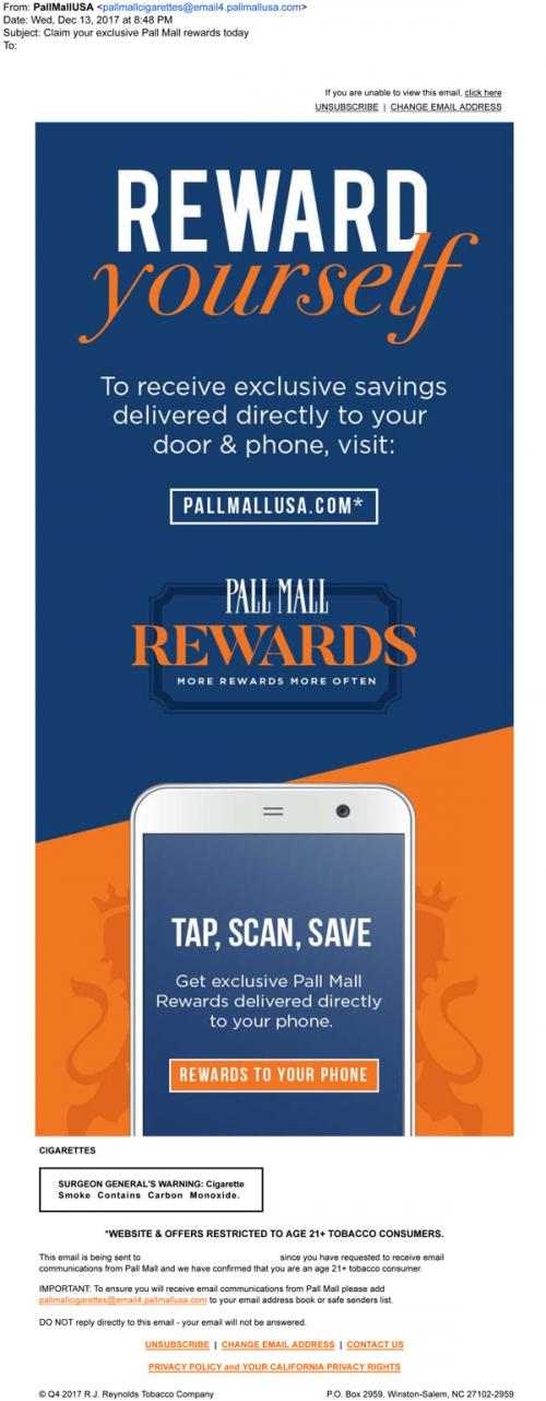 Email from Pall Mall in December 2017 promoting their rewards program, where customers can get coupons via mail or mobile phone. Links to the brand website to claim them.