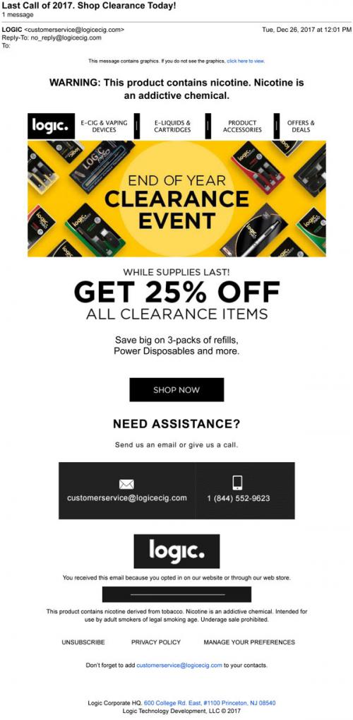 Email from Logic in December 2017 announcing a last call for the end of year clearance event sale through the brand website. Links to the online store to purchase.