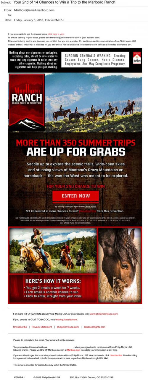 Email from Marlboro in January 2018 promoting the Marlboro Ranch sweepstakes, offering chances to win directly through emails. Includes a link to enter.