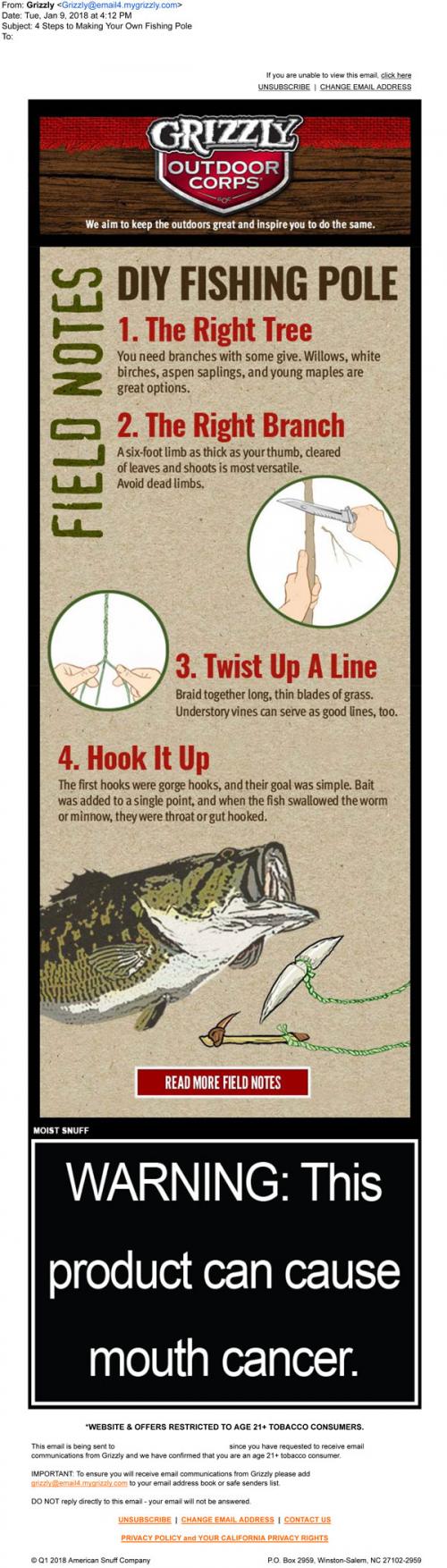 Email from the Grizzly Outdoor Corps in January 2018 with a link to check out the Field Notes on the brand website; the featured article is about making a DIY fishing pole.