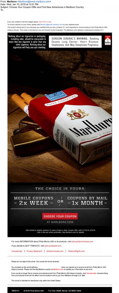 Email from Marlboro in January 2018 promoting the availability of coupons via mobile or mail, with a link to the brand website to claim them.