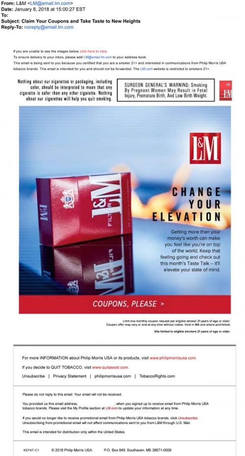 Email from L&M in January 2018 linking to claim a monthly coupon on the brand website.