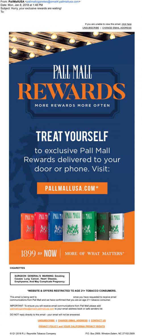 Email from Pall Mall in January 2018 promoting their Rewards program, with a link to claim direct mail or mobile coupons from the brand website.