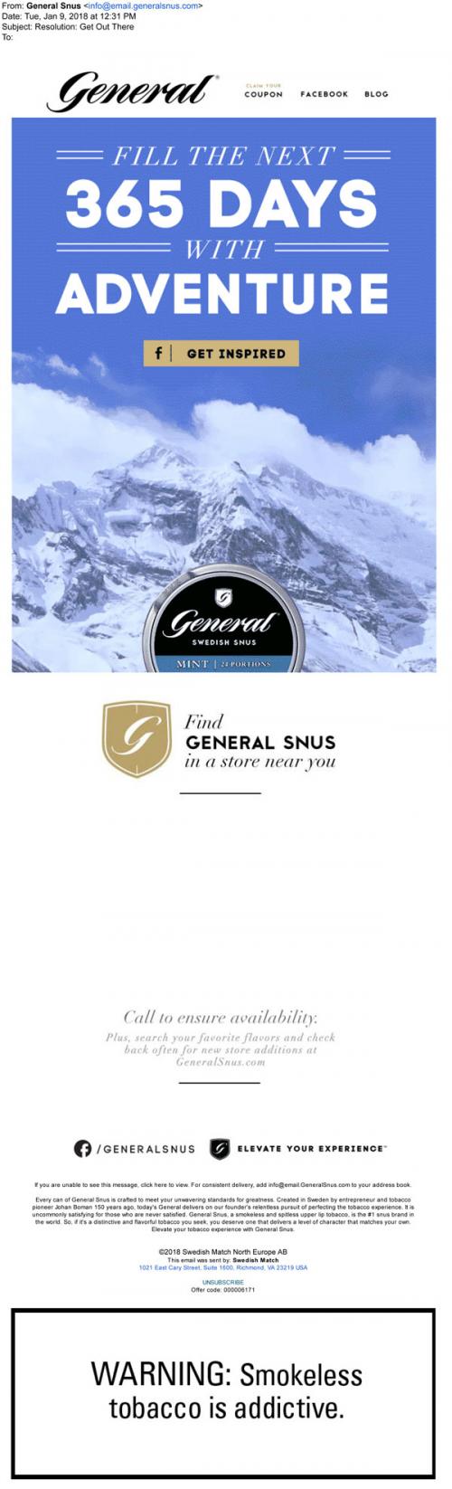 Email from General Snus in January 2018 directing the recipient to go to the brand Facebook page to "get inspired" with their adventure themed posts about things to do in the upcoming year. Also lists some nearby retailers and links to the brand website to claim coupons.