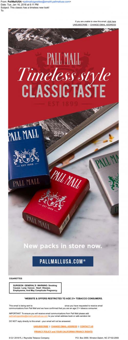 Email from Pall Mall in January 2018 promoting the arrival of the new packaging designs in stores. Links to the brand website to learn more.